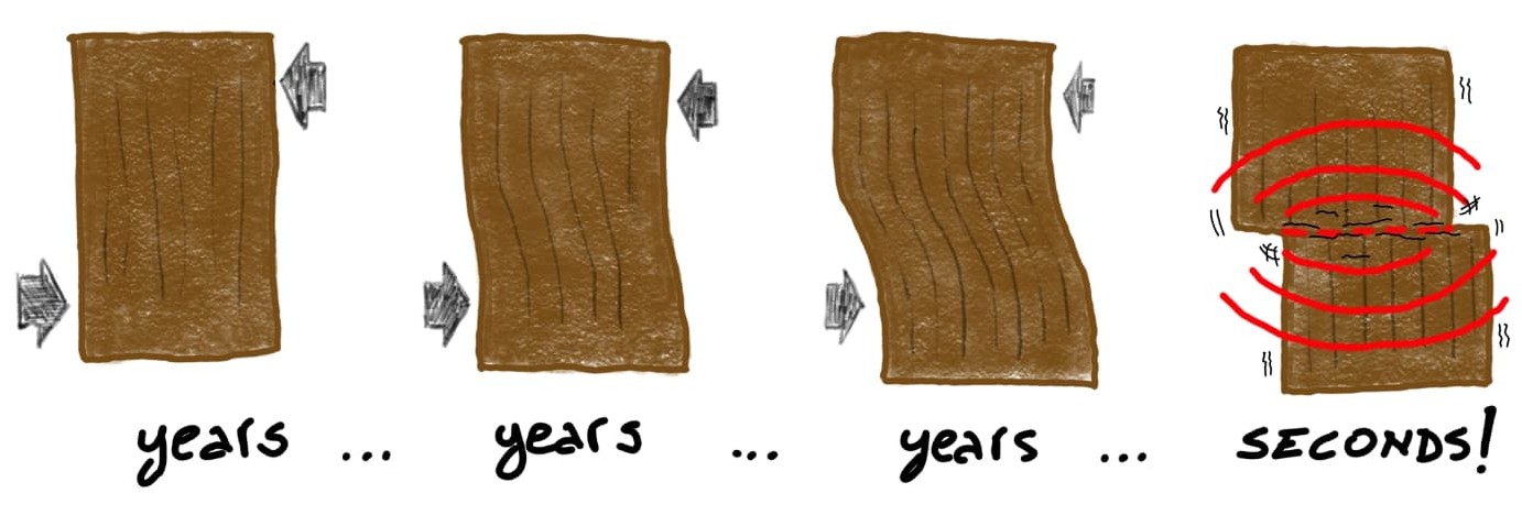 The Earth’s crust slowly deforms, storing energy like an elastic material, until it reaches a critical point: when it can no longer sustain the stress accumulated over years, the rock breaks in seconds.