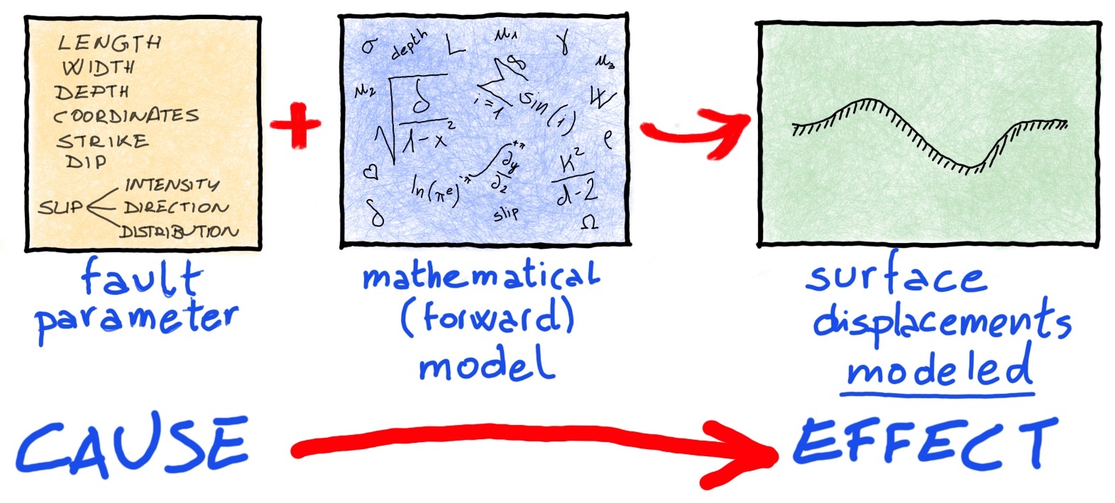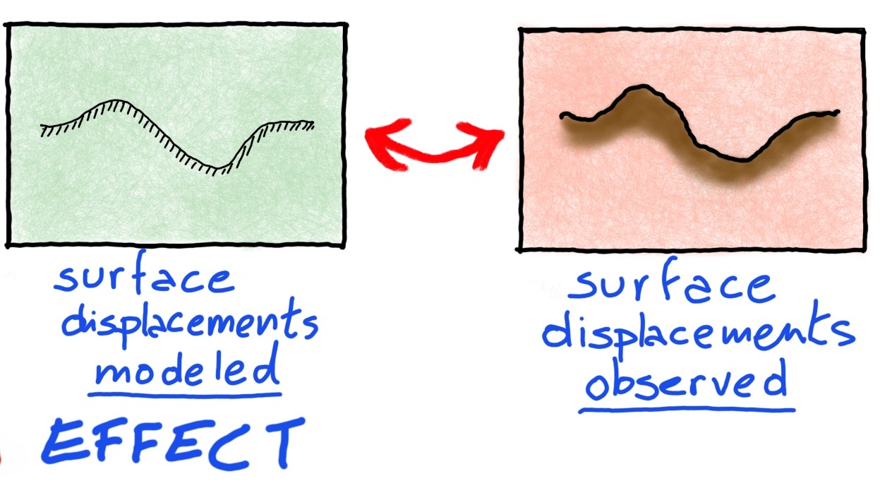 But here comes the problem: what fault parameters do we use to feed the model, if we do not know them? We are in the presence of what is called, in mathematics, an inverse problem: we see the effects of an earthquake (the deformations) and we want to infer the causes (the fault parameters).