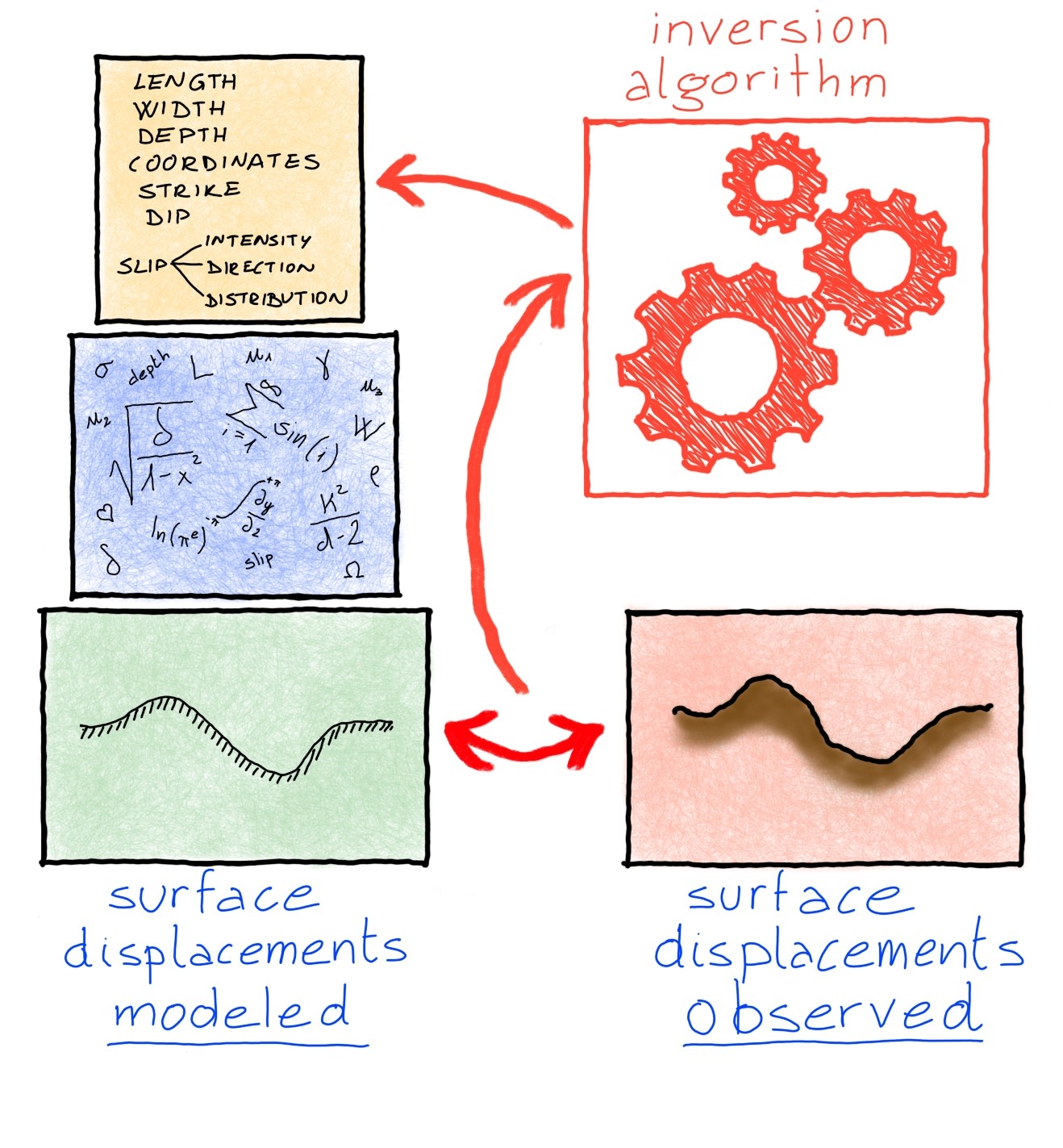 One could go by trial and error: we change the fault parameters until we find the ones that produce the most similar displacements to those observed. This is a legitimate but impractical way: there can be hundreds of parameters, and finding the right cocktail is not easy. There are more refined tools called inversion algorithms that do just that job for us: finding the source parameters that generate surface deformations as similar as possible to those observed.