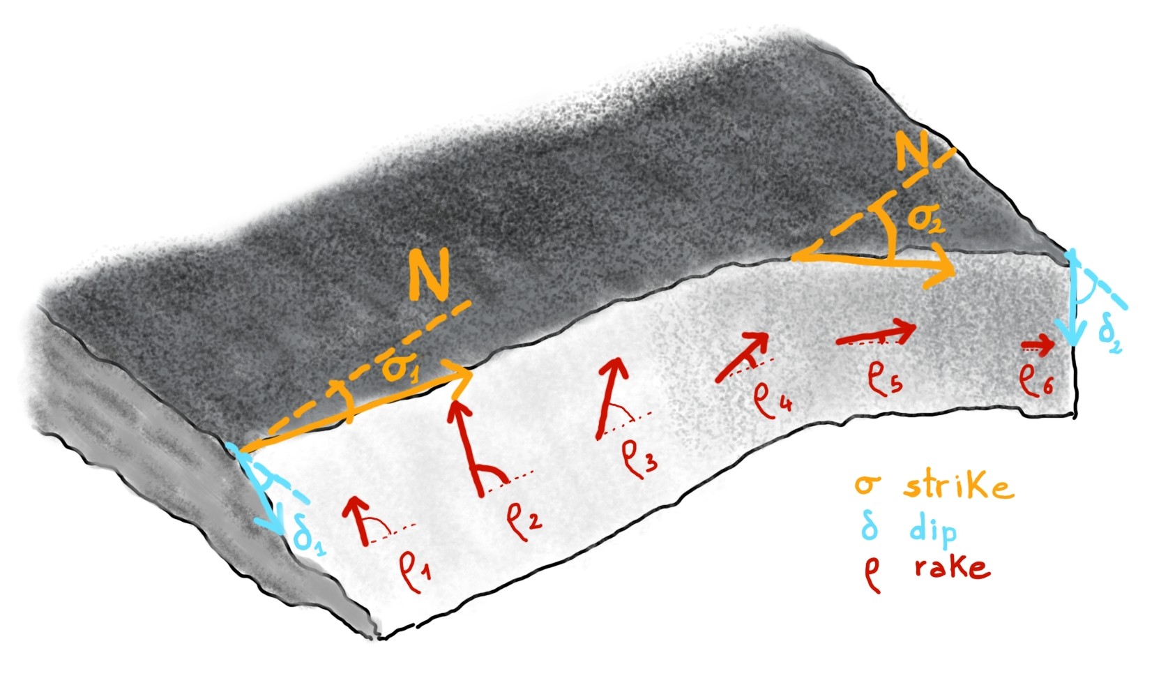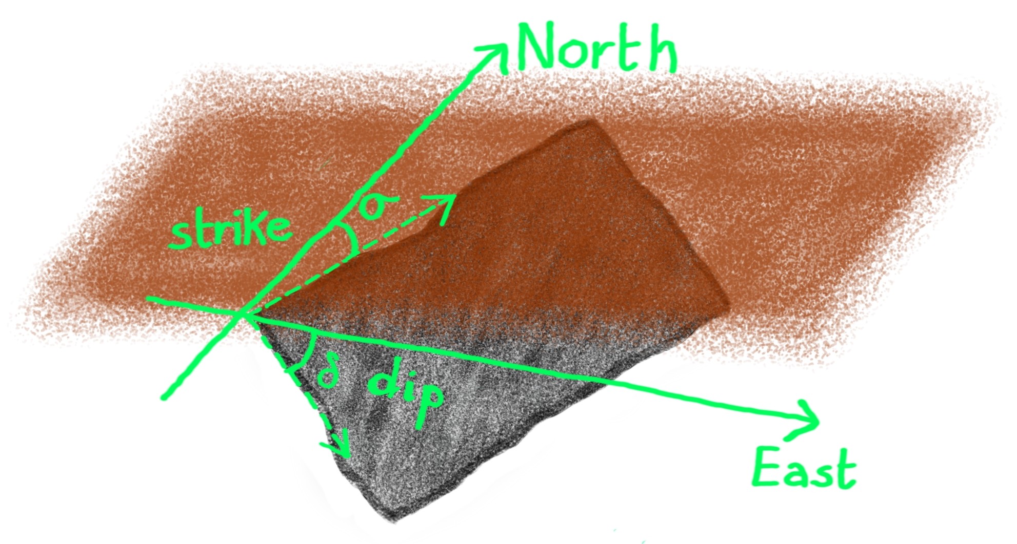 Two other angles are used to define the slope and orientation of the fault plane and are, respectively, the dip and the strike. The dip describes the angle of the fault plane with respect to an horizontal plane and the strike that between north and the upper edge of the fault.